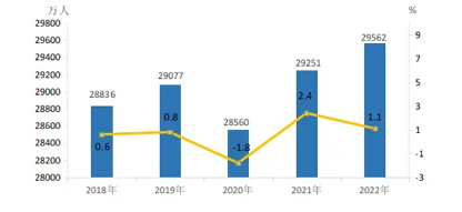 2022年全国农民工总量29562万人,比上年增加311万人,增长1.1%。其中,本地农民工12372万人,比上年增加293万人,增长2.4%;外出农民工17190万人,比上年增加18万人,增长0.1%。年末在城镇居住的进城农民工13256万人。