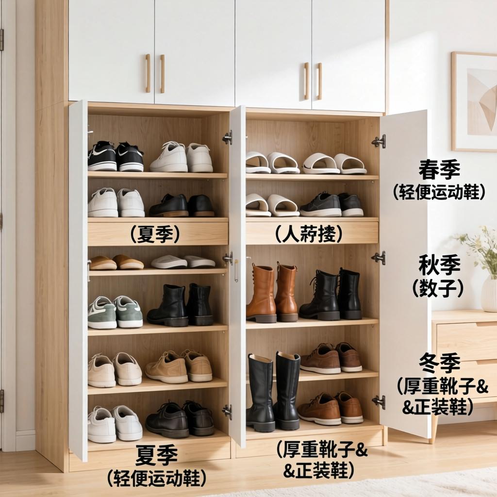 例如一些低帮的或者童鞋可放在鞋柜较低的层板间,高跟鞋可以放在较高的鞋层,这样不但可以提升鞋柜的收纳功能,而且为不同款式的鞋增添放置的地方。